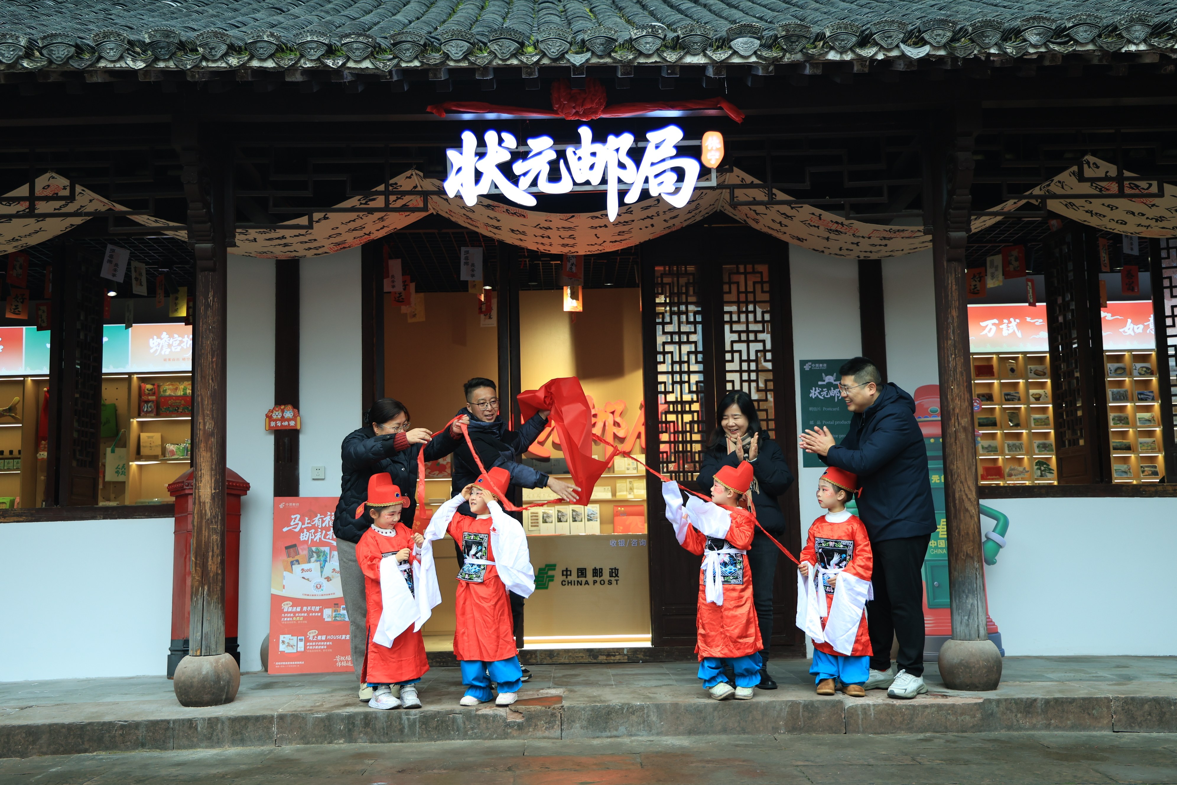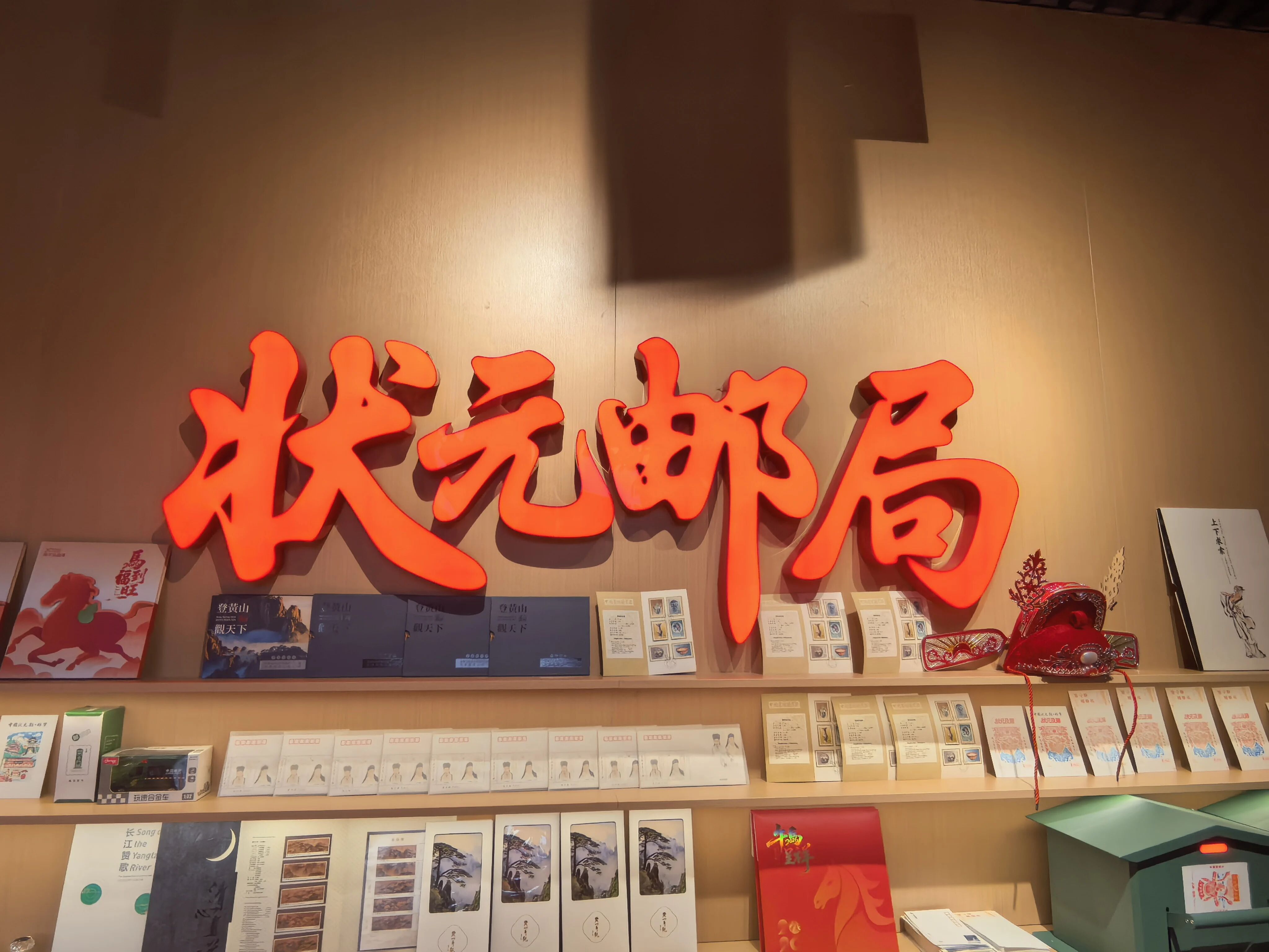作为一个融合了状元文化体验、主题邮品展销与互动打卡功能的复合空间,在这里,游客不仅可以选购独家设计的状元主题纪念封、明信片,还能现场书写祝福、加盖特色邮戳,即时书写邮寄,完成“从首发到寄递”的全流程体验,将一份“状元及第”的寓意投递远方。邮局内设置的“状元榜”祈福墙,更成为人气打卡点——提笔留愿,拍照留念,仿佛穿越百年与科举文化对话。